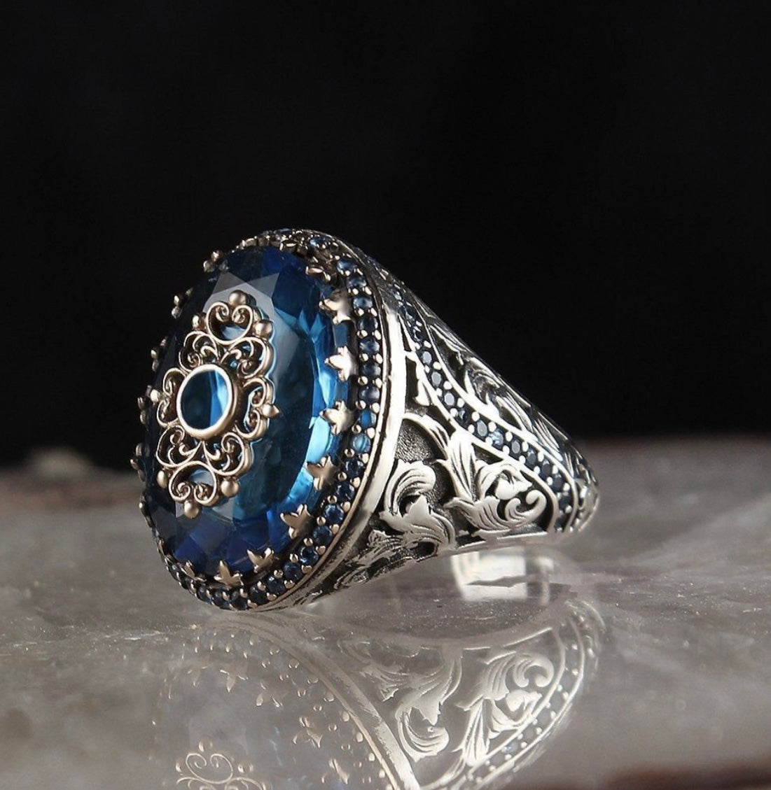 Inspirée par la splendeur des dynasties orientales, la bague Al Sultan incarne la puissance et le raffinement. Son imposante pierre bleue taillée en facettes capte la lumière avec intensité, tandis que les motifs floraux finement ciselés sur l’anneau évoquent un héritage royal et mystérieux.