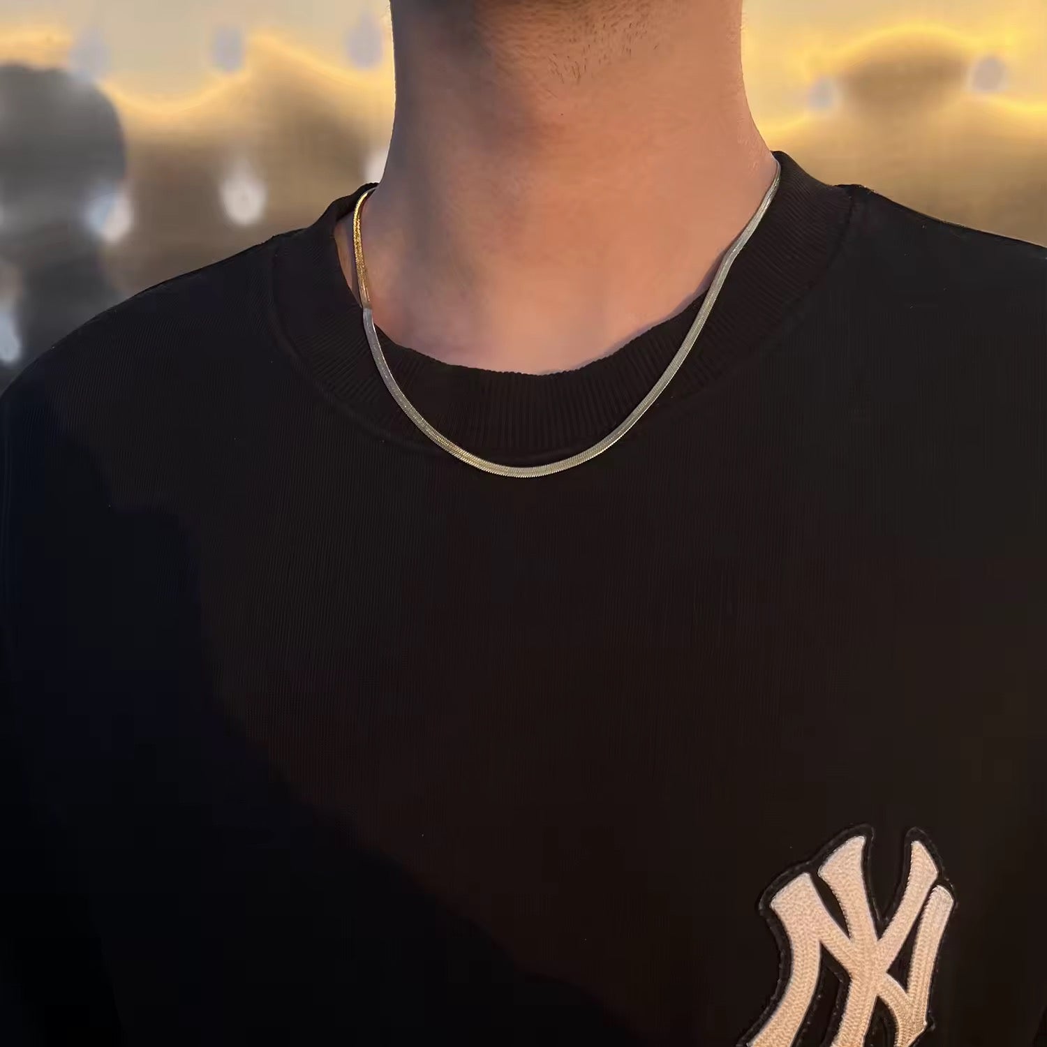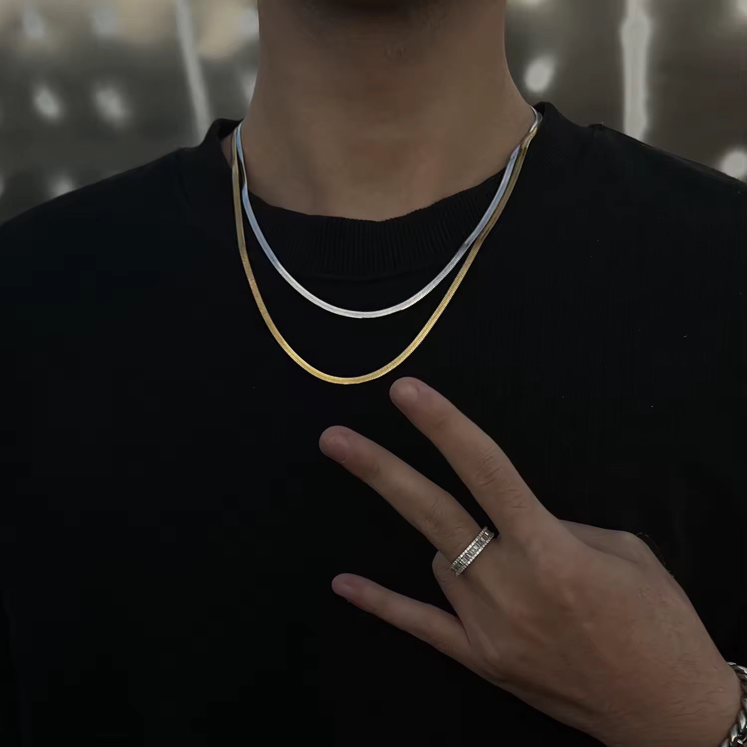 Ajoutez une touche d’élégance à votre style avec cette chaîne motif serpent pour homme au design moderne et minimaliste. Sa forme plate et souple offre un look raffiné qui s’adapte parfaitement aux tenues décontractées comme aux styles plus habillés.
