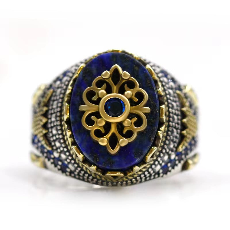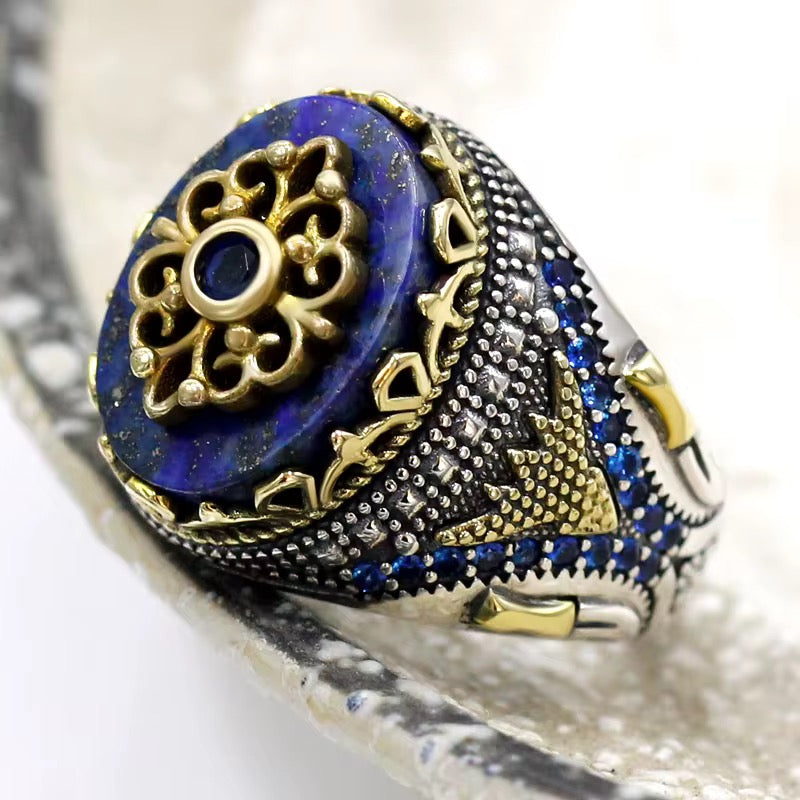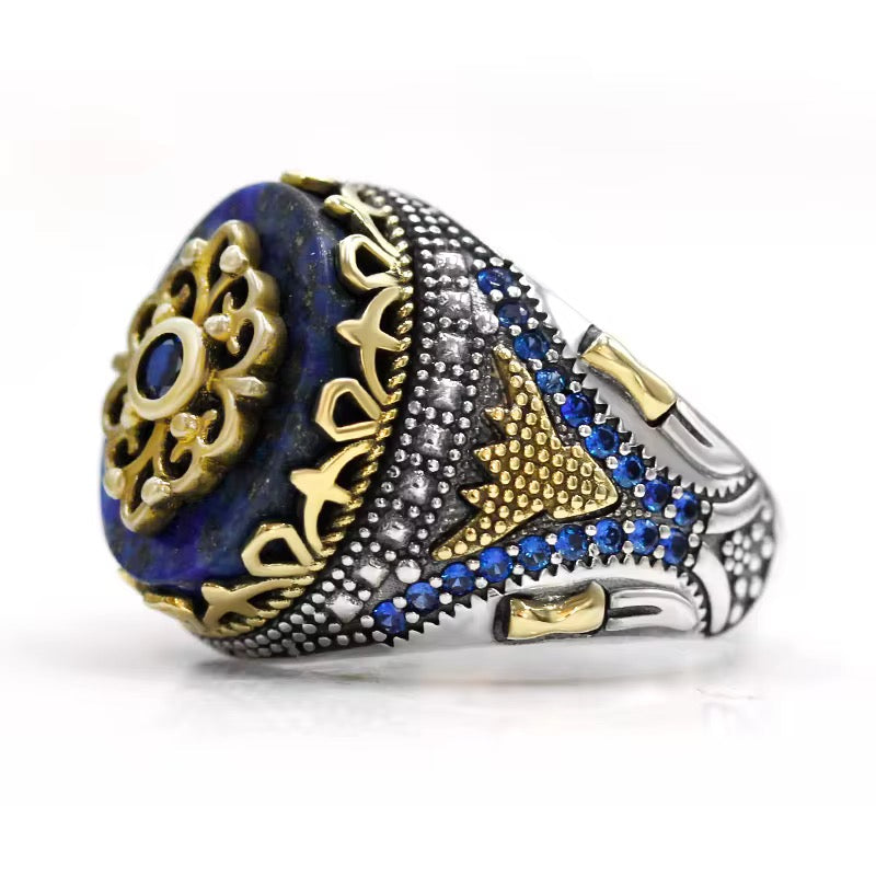 Évoquant la noblesse et le mystère des nuits orientales, Emir Al Qamar est une bague forgée en argent massif 925 et sertie d’un somptueux lapis lazuli naturel.